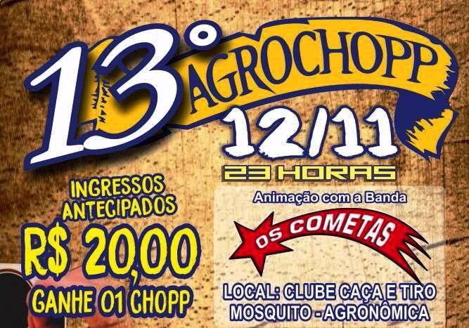 No Agrochopp, que será realizado no dia 12, os portões estão programados para abrir depois das 23h. A animação vai ficar por conta da banda Os Cometas, do Rio Grande do Sul. Os ingressos custam apenas R$20. Quem comprar o bilhete antecipado ainda vai ganhar um copo com chopp.