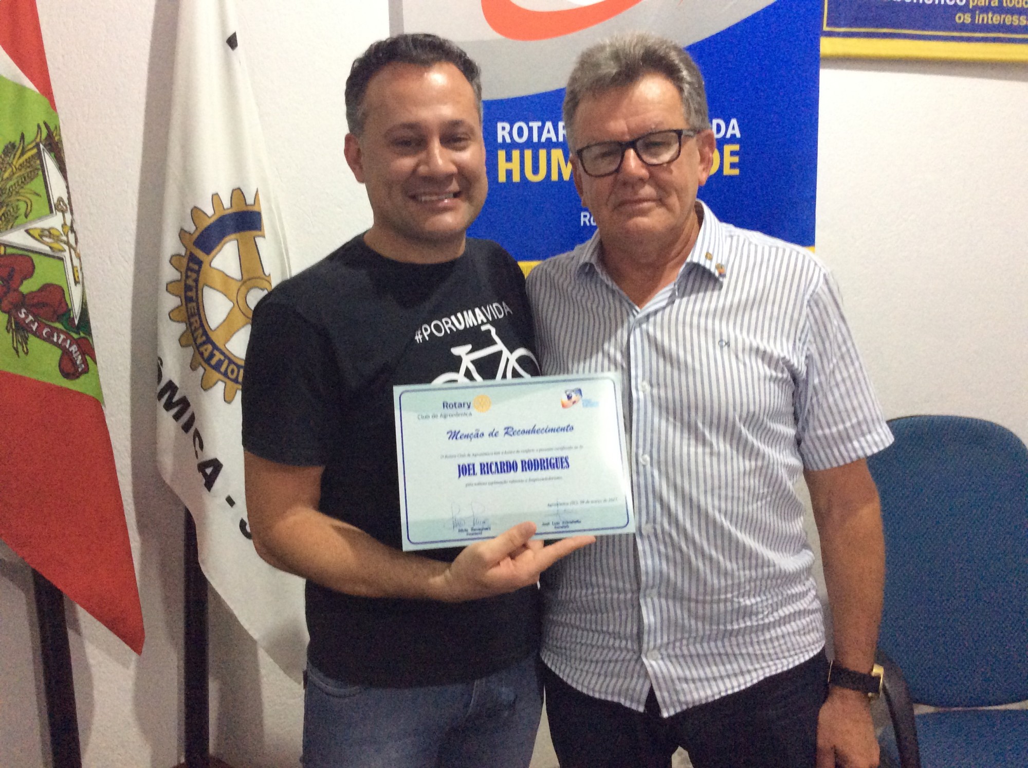 Joel Ricardo Rodrigues palestrou no Rotary Club de Agronômica Joel Ricardo Rodrigues palestrou no Rotary Club de Agronômica "Uma história em constante movimento". Esse foi o tema da palestra que foi ministrada pelo empresário Joel Ricardo Rodrigues. Hoje, o proprietário da empresa de Rio do Sul que vende bicicletas, JK Bike, falou um pouco sobre os desafios pessoais e profissionais. "Comecei como caminhoneiro. Já vendi melancia e tomate. Mas nem por isso eu desisti dos meus sonhos. Hoje eu vendo melhor acessibilidade através da bicicleta. Queria agradecer o convite do Rotary Club de Agronômica. Foi muito bom repartir experiências", destacou Joel. A utilização de uma bicicleta melhora a mobilidade e a qualidade de vida do ser humano. Nos últimos anos, Joel também desenvolveu um projeto vencedor. Hoje ele também fabrica a bicicleta elétrica "Woie". Para os próximos anos, o objetivo é captar recursos para alcançar novos desafios. "O mundo inteiro está mudando. A cada dia aumenta o número de bicicletas no Brasil aumenta. Ela vai ser o meio de transporte mais utilizado. Tenho certeza que o meu filho vai usar muito mais a bicicleta do que o carro", resumiu Joel. Ainda no primeiro semestre, Joel viajará para China. Desta vez, a intenção do empresário do Alto Vale é buscar novas parcerias para desenvolver projetos de acessibilidade para os deficientes físicos. Boa sorte Joel. Muito obrigado pela palestra. Seja sempre bem vindo no Rotary Club de Agronômica. No sábado, Joel realizou um desafio com a bicicleta. Ao lado do companheiro de Rotary, Moacir da Rosa, eles viajaram de bicicleta de Rio do Sul até Balneário Camboriú. Foram aproximadamente 12 horas pedalando. "Foi maravilhosa a experiência. Espero que outros companheiros possam fazer o mesmo em outras oportunidades. Vencer um desafio pessoal não tem preço e é inesquecível", ressaltou Moacir da Rosa.