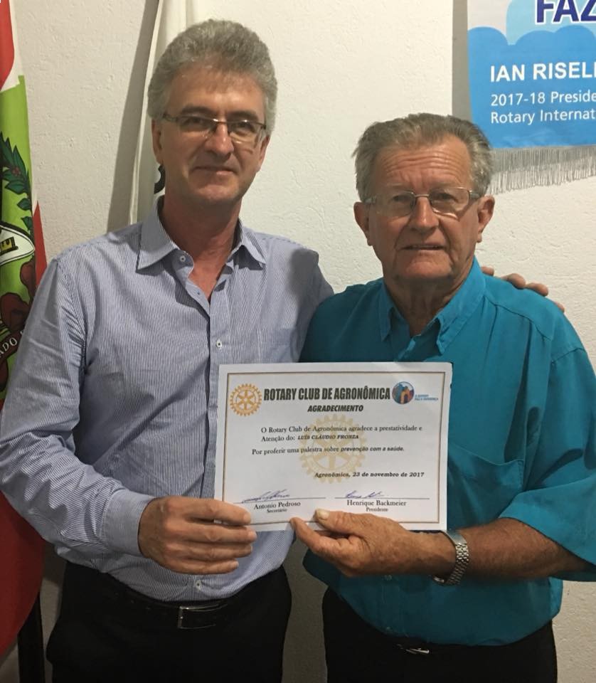 O médico cardiologista Luiz Claudio Fronza recebeu um diploma de agradecimento do presidente do Rotary, Henrique Backmeier. Ele ministrou uma palestra, na noite de quinta-feira (23), sobre “Qualidade de Vida”.