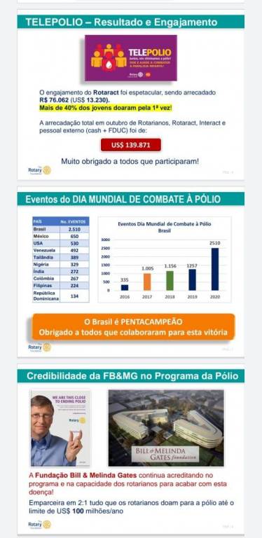 "Realizamos um primeiro semestre do ano rotário 2020-2021 muito louvável, sob a coordenação do ex-governador Adriano Zanotto, envolvendo as ações de conscientização e arrecadação", ressalta a coordenadora da Subcomissão, que agradece a todos rotarianos e clubes que doaram e se envolvem em nossa causa da Pólio!