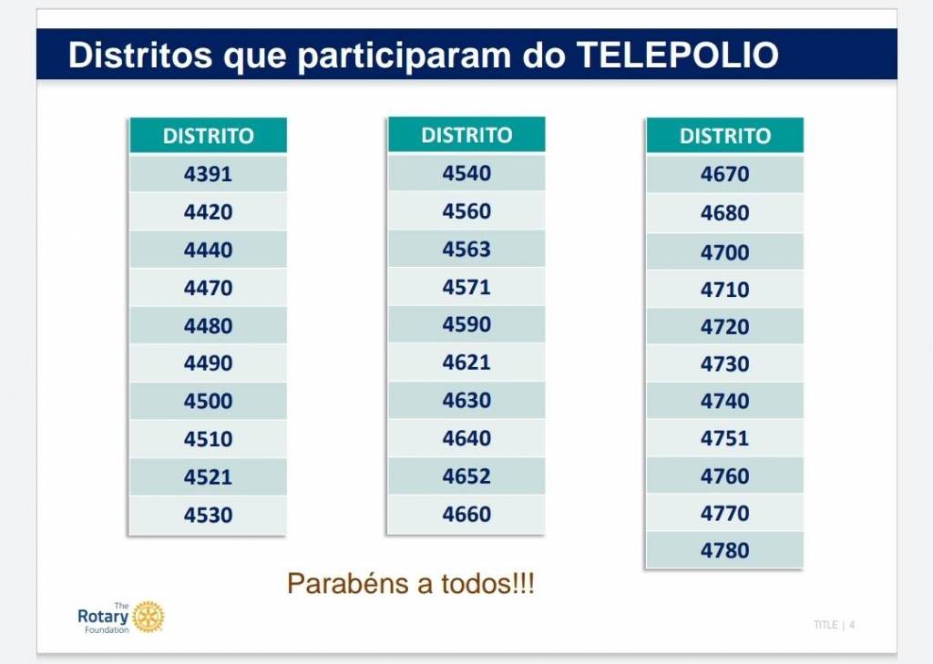 A Comissão Distrital da Subcomissão da Pólio agradece aos rotarianos que contribuíram para a causa da Pólio, em especial no mês de outubro de 2020 durante a Campanha TELEPÓLIO.
